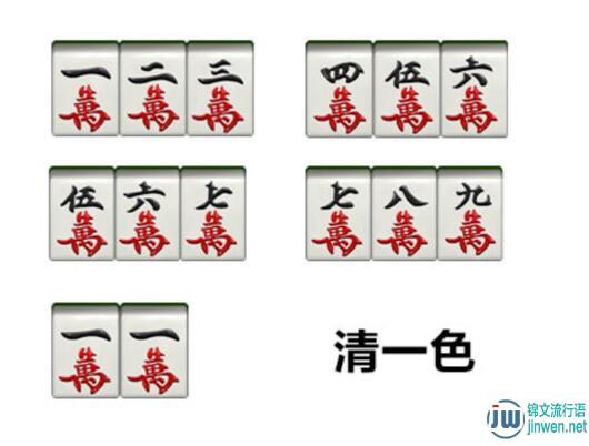 手牌中全部是同一种花色(可吃碰杠)并且牌型符合m*AAA+n*ABC+DD,此时胡牌牌型为清一色。