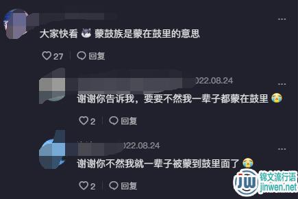“蒙鼓族”“蒙鼓人”该梗出自视频评论区,这里与真正的“蒙古族”无关,而是部分网友面对他人评论解释时的固定回复,因常常被蒙在鼓里,而被调侃为“蒙鼓族”,玩这个梗大多都是逗比,他们并不是真的不懂,而是在故意玩梗逗大家一乐。